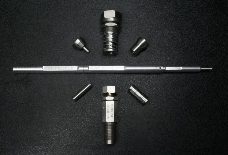The Superior Precision tool set was designed to take advantage of the way that rimless cartridges rely on the shoulder to shoulder contact between the chamber and case to position the bullet. The Superior Precision tool set includes a Neck Sizer with two die, a Chamber Gauge, a Cartridge Gauge, an adjustable Headspace Gauge, and a Bullet Seater.